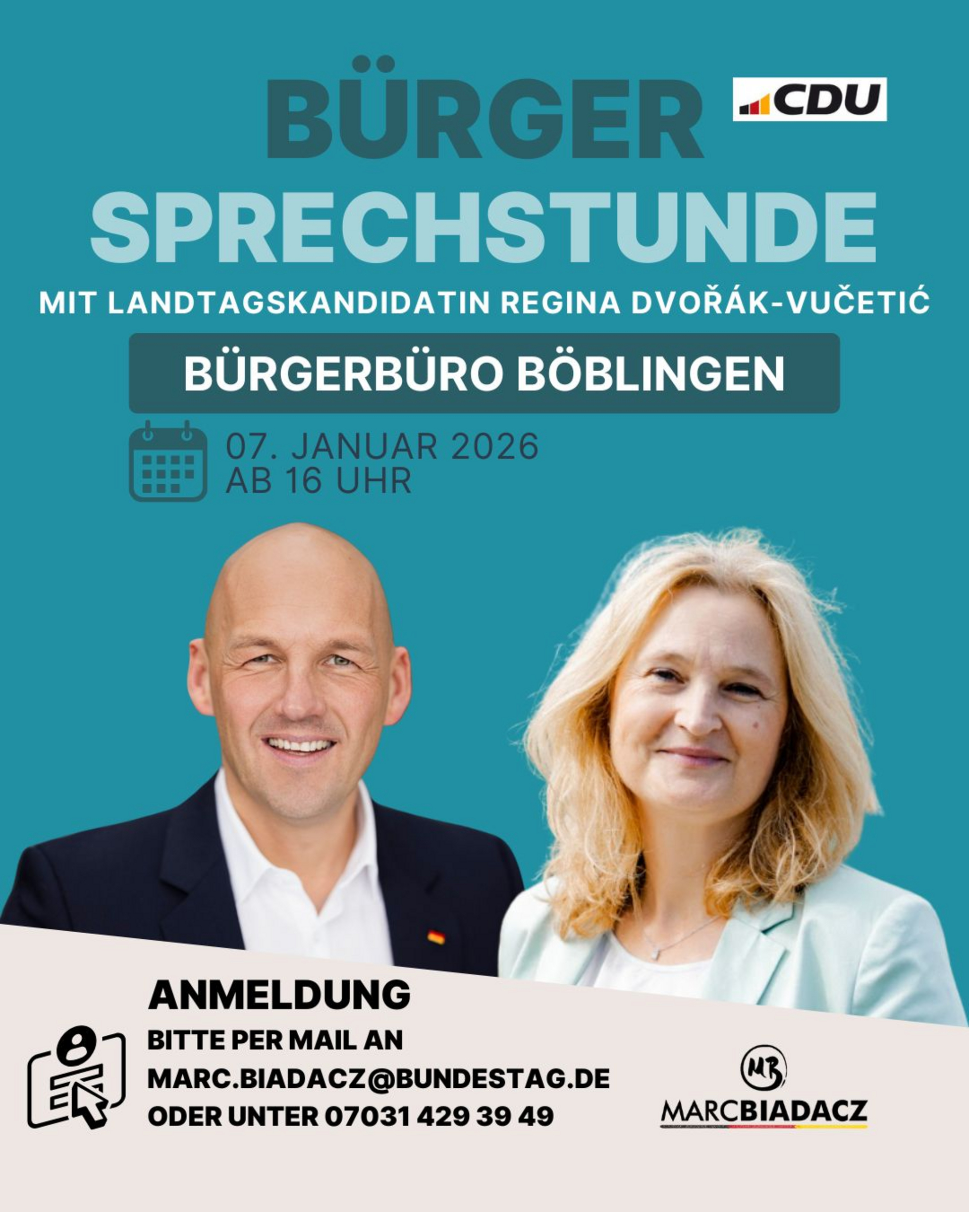 Anmeldung bitte per Mail an marc.biadacz@bundestag.de oder unter 07031 4293949